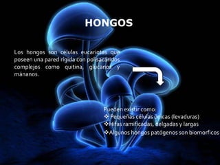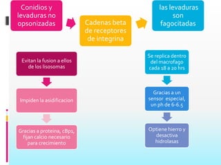 Este documento describe la respuesta inmune ante las infecciones por hongos. Explica que los hongos son células eucariotas con pared rígida que pueden causar micosis en animales y vegetales. Detalla los factores de virulencia de los hongos patógenos y los mecanismos de defensa del huésped, incluyendo la inmunidad innata y adaptativa. Finalmente, analiza varias enfermedades micóticas como la aspergilosis, coccidioidomicosis, blastomicosis y candidiasis.