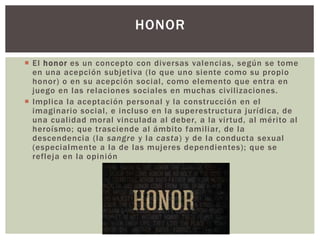 Este documento define y explora los conceptos de honor, disciplina y lealtad. Define el honor como un concepto moral vinculado al deber y la virtud que trasciende las relaciones familiares. La disciplina implica enseñar un código de conducta a través de la autodisciplina o sanciones. La lealtad es la devoción a una persona, causa o grupo y requiere fidelidad, franqueza y sinceridad.