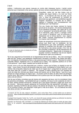 El documento aborda el caso judicial de Datxu Peris, quien enfrenta acciones legales por una reflexión publicada tras la muerte del torero Víctor Barrio, en la que critica la tauromaquia, declarando que este oficio causa muertes y sufrimiento a los toros. La Fundación del Toro de Lidia intenta distorsionar sus palabras y utilizar judicialmente la muerte de Barrio para silenciar la lucha antitaurina, alegando un ataque al honor, mientras que los defensores de Peris argumentan que su derecho a la libertad de expresión debe ser protegido. Se denuncia la instrumentalización de la justicia y se resalta la importancia de defender los derechos civiles y la opinión crítica sobre prácticas consideradas crueles e inhumanas.