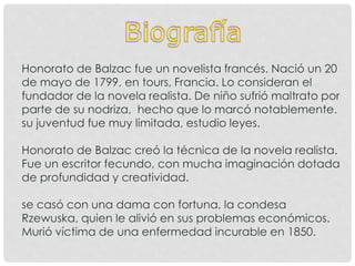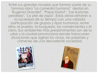 Honoré de Balzac compuso 91 obras en 'La comedia humana', ofreciendo un panorama de la vida francesa desde la revolución hasta su tiempo. Clasificó sus novelas en estudios de costumbres, filosóficos y analíticos, creando más de dos mil personajes. Su enfoque realista le permitió explorar temas inusuales en la literatura.