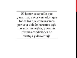 El documento habla sobre el honor, la disciplina y la lealtad. Define el honor como un concepto con diferentes significados dependiendo de si se considera de forma subjetiva o social. Explica que la disciplina se refiere a la coordinación de actitudes para desarrollar habilidades siguiendo un código de conducta. Finalmente, señala que la lealtad es la devoción a un estado, persona u organización, aunque no hay acuerdo sobre qué cosas se puede ser leal.
