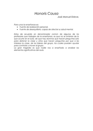 El documento discute cómo la enseñanza puede ser una fuente de realización personal o desequilibrio mental para algunos, y cómo algunos profesores no se dan cuenta de lo que realmente ocurre en el aula, como algunos estudiantes que hacen preguntas solo para detener la clase mientras que otros lo hacen porque realmente les interesa la materia. También menciona que no se les ha enseñado a los profesores a analizar los elementos significativos del aula.