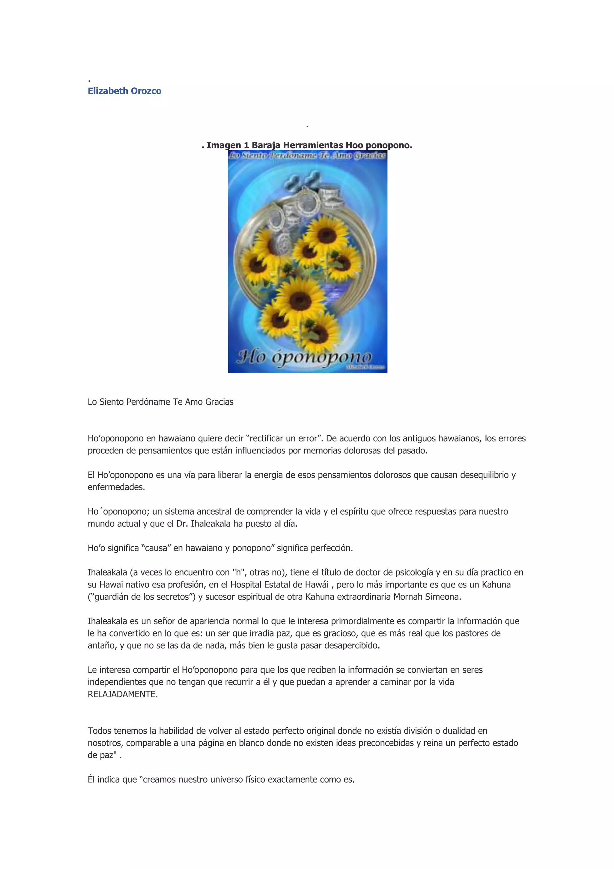 El documento habla sobre Ho'oponopono, una antigua práctica hawaiana para corregir errores mentales. Consiste en repetir las frases "Lo siento, perdóname, te amo, gracias" para limpiar pensamientos dolorosos del pasado y alcanzar un estado de paz perfecta. También describe cómo un psicólogo hawaiano curó pacientes criminales insanos solo trabajando en sí mismo y aplicando los principios de Ho'oponopono.