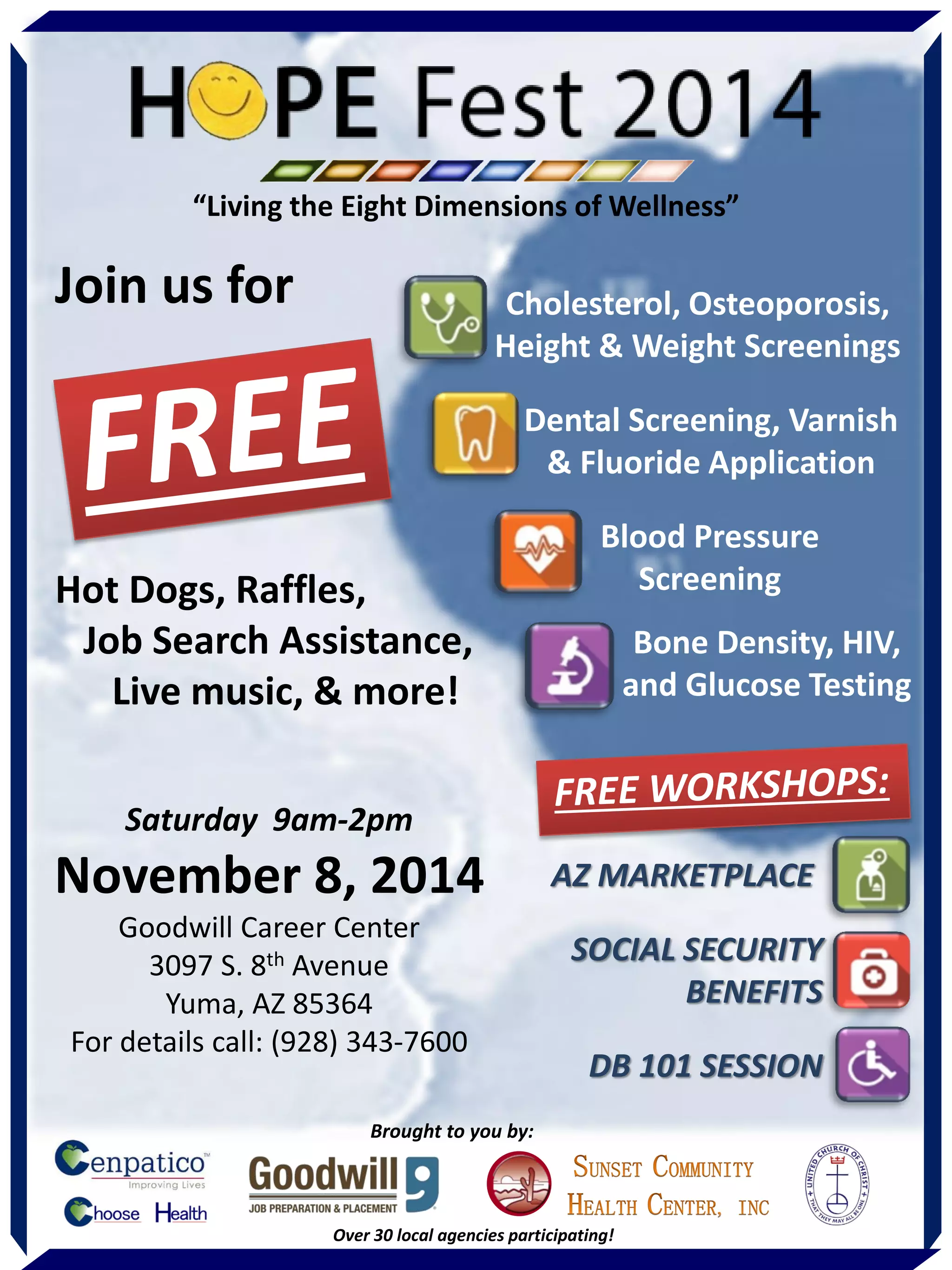 El documento anuncia un festival que se llevará a cabo el 8 de noviembre de 2014 en el Goodwill Career Center en Yuma, Arizona. El festival ofrecerá exámenes médicos gratuitos, asistencia para la búsqueda de empleo, música en vivo y más. Más de 30 agencias locales participarán en el evento para proporcionar recursos a la comunidad.