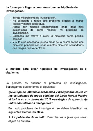 La hipótesis de investigación es una posible solución tentativa al problema de investigación, basada en el conocimiento previo del investigador sobre el tema. Sirve para guiar la recolección de datos que permitan resolver el problema planteado. El investigador establece hipótesis sin saber si serán verdaderas o falsas, lo que intentará demostrar mediante la investigación. Se crean hipótesis principales y secundarias luego de analizar a fondo el problema, la población, el contexto y las variables, con base en la literatura revisada.