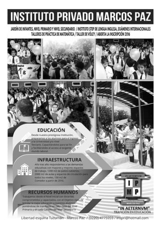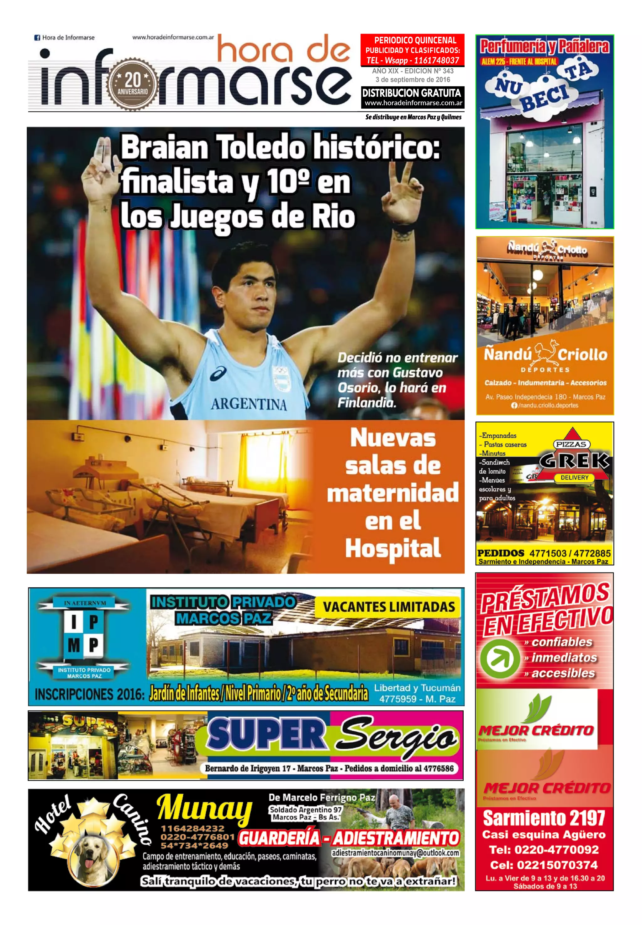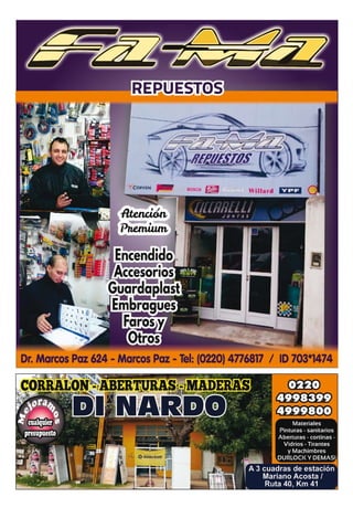 El documento contiene varias noticias locales de Marcos Paz. Reporta sobre el vertido ilegal de residuos de mataderos que está contaminando el arroyo Morales y afectando la salud de los vecinos. También habla sobre la entrega de kits de emergencia a escuelas rurales, la apertura de dos nuevas salas de maternidad en el hospital municipal y un incidente armado durante una disputa vecinal.