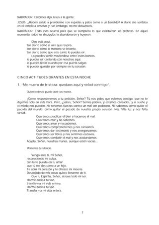 Este documento narra los eventos de la Última Cena de Jesús con sus discípulos hasta su arresto en el Huerto de los Olivos. Describe la tristeza de Jesús ante su destino, su oración al Padre para que pase de él "ese cáliz", y cómo es traicionado y arrestado por Judas. Concluye con los discípulos abandonando a Jesús y huyendo del lugar.