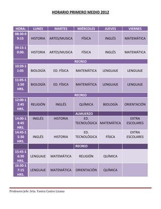 El horario semanal de la primera media incluye asignaturas como Historia, Artes, Música, Física, Inglés y Matemática los días lunes y martes por la mañana, y Biología, Educación Física y Lenguaje los miércoles y jueves por la mañana. Las tardes incluyen Inglés, Historia, Educación Tecnológica, Física y actividades extraescolares.