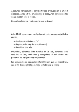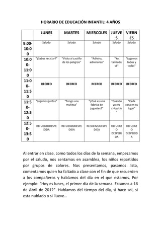 El horario de educación infantil de los niños de 4 años incluye actividades diarias como el saludo, recreo, y despedida. Cada día de la semana se enfoca en un tema diferente como reciclaje, visitas al castillo, o fabricas de juguetes. Las actividades están diseñadas para enseñar a los niños sobre diferentes temas mientras los mantienen en una rutina.
