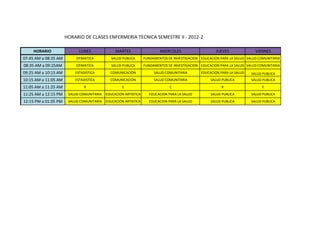 El documento presenta el horario de clases para el semestre II de 2012 para la carrera de Enfermería Técnica. En las mañanas de lunes a viernes se imparten asignaturas como Ofimática, Estadística, Salud Comunitaria, Educación para la Salud y Salud Pública. Las tardes de lunes y miércoles se enseñan Salud Comunitaria y Educación para la Salud, mientras que los martes y jueves incluyen Educación Artística y Salud Pública.
