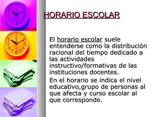 HORARIO ESCOLAR El horarioescolar suele entenderse como la distribución racional del tiempo dedicado a las actividades instructivo/formativas de las instituciones docentes. En el horario se indica el nivel educativo,grupo de personas al que afecta y curso escolar al que corresponde.