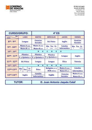 El documento presenta el horario escolar de la semana para el curso 4o de Educación Secundaria Obligatoria en el IES Mar de Aragón en Maella. El horario incluye las asignaturas y horas de clase para cada día de la semana, así como los profesores a cargo de cada asignatura y el tutor del curso.