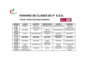 El documento presenta el horario de clases semanal de 4o de Educación Secundaria Obligatoria, con las asignaturas que se imparten cada día de la semana, organizadas en seis periodos de clase de 50 minutos cada uno, con un receso de 15 minutos a mitad de la mañana. El tutor del curso es Terio Telechea Montes.
