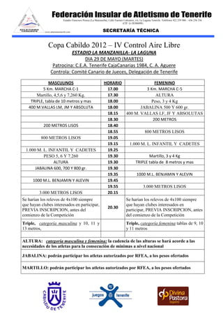 Este documento anuncia la Copa Cabildo 2012, un evento de atletismo al aire libre que tendrá lugar el 29 de mayo en el Estadio La Manzanilla en La Laguna, Tenerife. La competición incluirá varias pruebas de carrera, salto y lanzamiento para categorías masculinas y femeninas. El horario detalla los eventos programados y sus horarios.