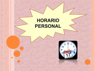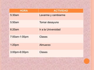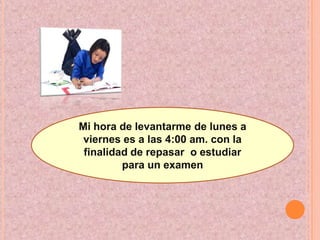 Este documento describe la rutina diaria y horario de una persona. Se levanta a las 4 am de lunes a viernes para estudiar y repasar para exámenes. Los fines de semana se levanta más tarde, a las 4 o 6 am dependiendo de la tarea, y usa el tiempo libre para relajarse con amigos o bailando.