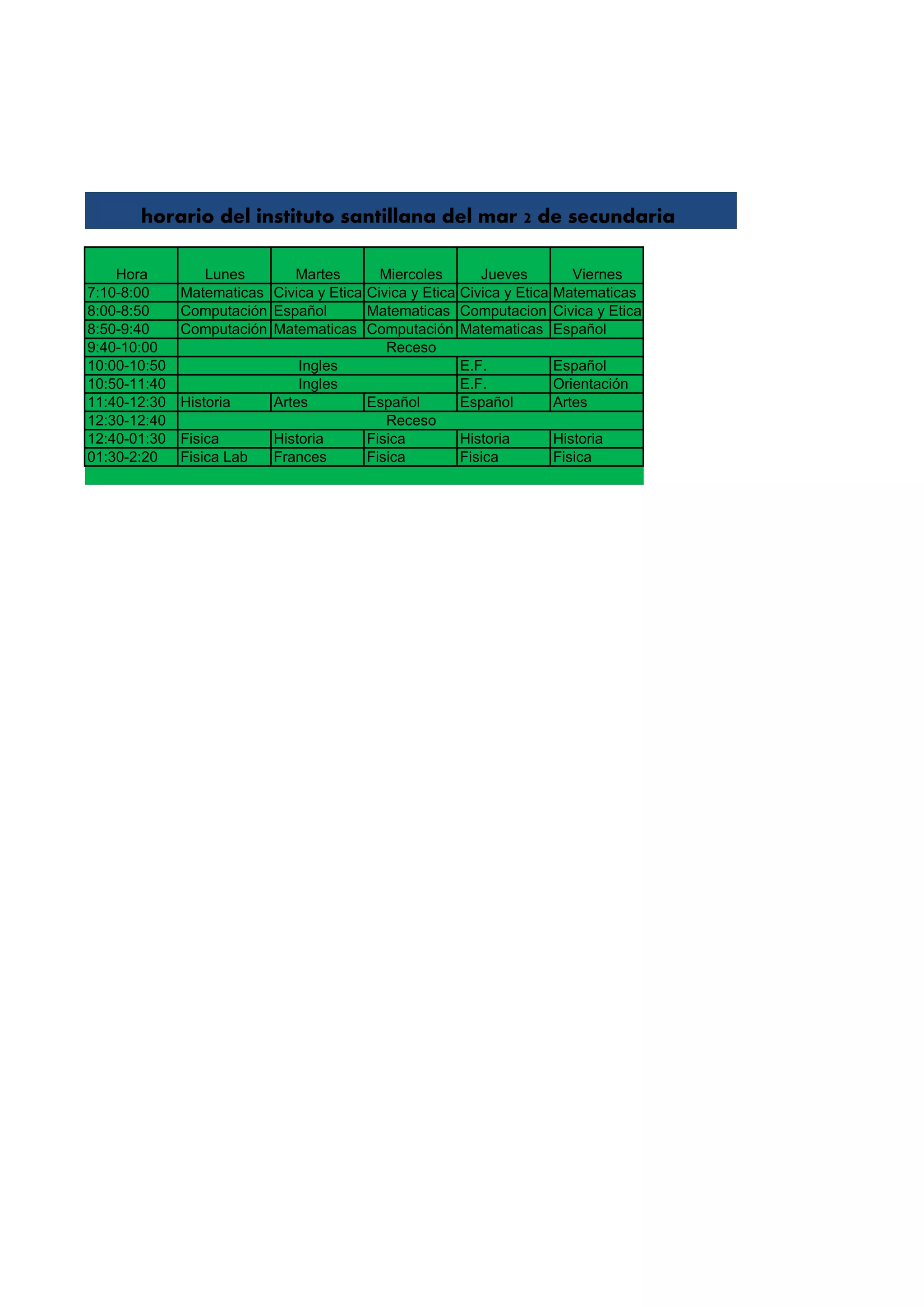 El horario escolar del Instituto Santillana del Mar para el segundo curso incluye asignaturas como Matemáticas, Computación, Español, Inglés, Ética, Historia, Física y Artes repartidas durante la semana con diferentes horarios cada día. Las clases se imparten durante las mañanas de lunes a viernes con dos recreos de 10 y 30 minutos.