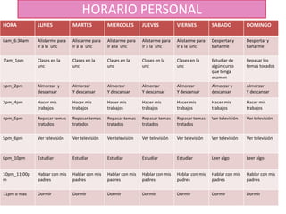 Este documento presenta el horario personal de una estudiante de la Universidad Nacional de Cajamarca para el curso Metodos y Técnicas de Estudio. El horario detalla las actividades académicas y personales de la estudiante, incluyendo las horas de clase, tiempo de estudio, descanso y ocio. El objetivo es organizar eficientemente el tiempo de la estudiante para cumplir con sus responsabilidades académicas.
