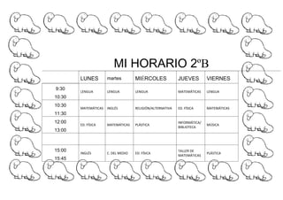 El horario de la clase 2oB incluye asignaturas como Lengua, Matemáticas, Inglés, Educación Física, Religión y Plástica durante la semana, con variaciones en los días y horarios de cada materia.