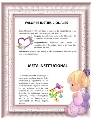 El documento presenta la misión, visión, valores institucionales y meta del Centro Educativo Mi Dulce Hogar. Su misión es facilitar el aprendizaje de los niños a través de actividades lúdicas y pedagógicas que desarrollen habilidades humanas, sociales e investigativas en un ambiente de amor. Su visión es seguir siendo una institución modelo en valores que propicie el desarrollo integral de los estudiantes. Los valores institucionales son el amor, respeto, responsabilidad y solidaridad. Su meta es satisf