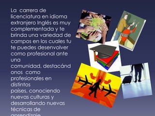 Este documento describe las razones para estudiar la licenciatura en inglés. Ofrece una variedad de campos profesionales como profesora en colegios, universidades u opciones como traductora. También enfatiza la importancia de encontrar nuevas formas de enseñanza para preparar a las generaciones futuras para una sociedad en constante cambio a través de estrategias innovadoras y creativas.
