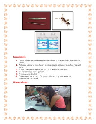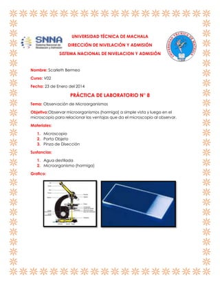 Este resumen describe una práctica de laboratorio realizada por una estudiante para observar microorganismos como las hormigas usando un microscopio. La estudiante observó una hormiga primero a simple vista y luego con un microscopio a 10 aumentos, notando que el microscopio permitió ver detalles más pequeños. La conclusión fue que el microscopio es útil para observar seres pequeños en laboratorios.