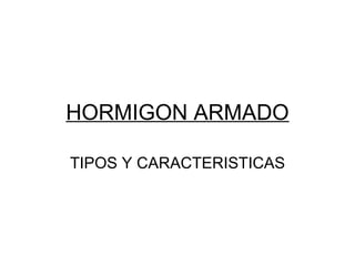 El documento describe los tipos y características del hormigón armado, incluyendo su composición, resistencia a la compresión y tracción, tipos según su fraguado, características físicas, elaboración en planta o in situ, y elementos estructurales comunes como bases, columnas y vigas.