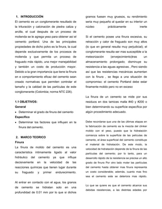 Este informe de laboratorio se centra en el cálculo del porcentaje de finura de diferentes muestras de cemento utilizando un tamiz #200. Se tomaron muestras de cemento de varias fuentes y se colocaron en el tamiz, pesando las partículas retenidas para calcular el porcentaje de finura según la norma. Los resultados mostraron que cinco de las seis muestras tenían un porcentaje de finura adecuado de acuerdo con las normas, mientras que la sexta muestra tuvo un porcentaje