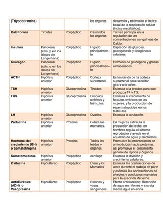 Este documento describe las características de varias hormonas, incluyendo su lugar de producción, composición química, célula blanco y función principal. Las hormonas regulan procesos como el metabolismo, crecimiento, desarrollo sexual, reproducción y homeostasis. Algunas hormonas clave son la insulina y glucagón, que regulan los niveles de glucosa; las hormonas sexuales como estrógenos y testosterona; y las hormonas hipofisiarias que controlan otras glándulas endocrinas.