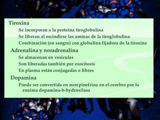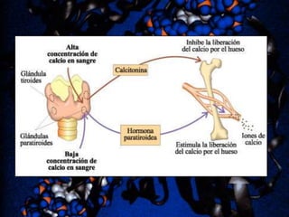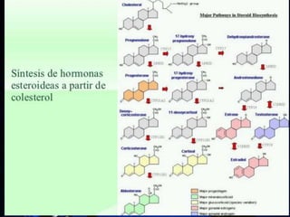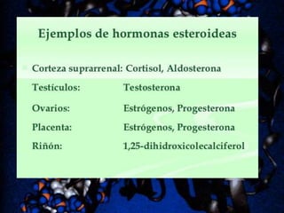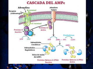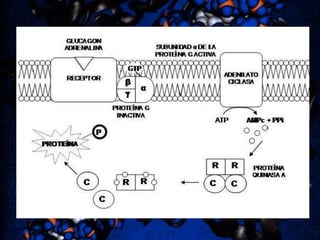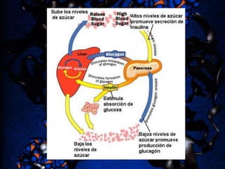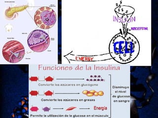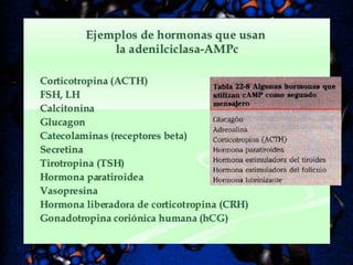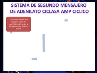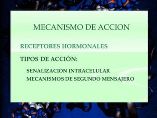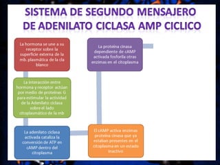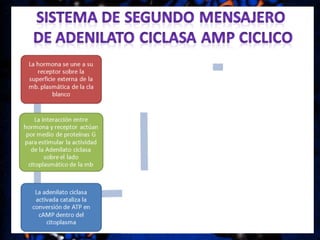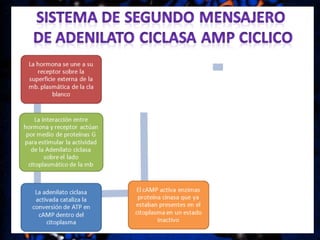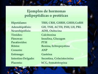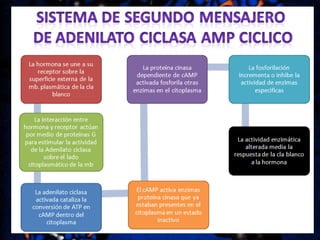 El documento resume los conceptos básicos sobre el sistema endocrino, incluyendo las diferentes clases de hormonas, sus mecanismos de acción a través de segundos mensajeros y receptores, y ejemplos específicos como la insulina, glucagón y parathormona.