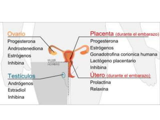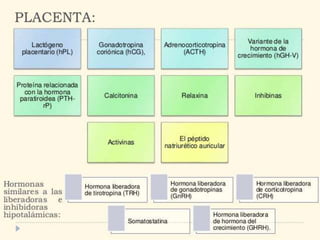 El documento resume las principales hormonas placentarias y sus funciones. La gonadotropina corionica humana (hCG) se produce en la placenta y estimula la producción de progesterona. El lactogeno placentario humano (hPL) promueve la lipólisis materna. Otras hormonas incluyen corticotropina corionica, relaxina, y proteína relacionada con la hormona paratiroidea. La placenta también produce grandes cantidades de progesterona, estrógenos y hormonas liberadoras como la gonadotrop