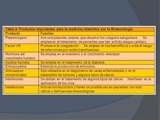 La biotecnología moderna se aplica a la elaboración de productos para mejorar la salud como medicamentos, pruebas de diagnóstico, hormonas, factores de coagulación, anticuerpos, anticancerígenos y vacunas. La ingeniería genética se utiliza para producir hormonas como la insulina y la somatostatina. Las nuevas vacunas contienen sólo pequeños fragmentos de microorganismos patógenos para lograr la inmunización.