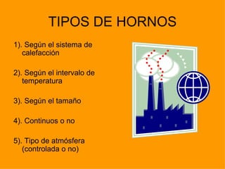 El documento describe diferentes tipos de hornos y calderas, incluyendo hornos de carga única o continuos, hornos continuos como de solera vibratoria o de empuje, hornos de atmósfera controlada para evitar cambios en la superficie del metal, hornos para recocer o templar usando cámaras o baños de sales, y hornos de circulación de aire con ventiladores.