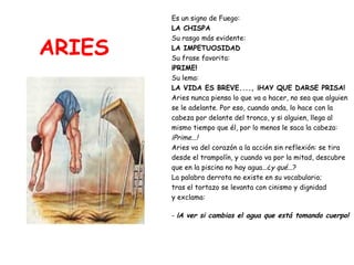 El documento resume las características principales de cada uno de los signos del zodiaco. Describe rasgos distintivos de personalidad, frases favoritas y lemas para cada signo. Resalta que cada uno se distingue por su forma de ser, actuar y ver la vida.