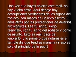 Este documento presenta descripciones de los signos del zodiaco, indicando rasgos positivos y negativos de cada uno. Afirma que las predicciones son verdaderas y advierte que quien no reenvíe el mensaje tendrá mala suerte. Describe cada signo brevemente y concluye instando a reenviar el mensaje con una cantidad específica de años de mala suerte asociada a cada signo.