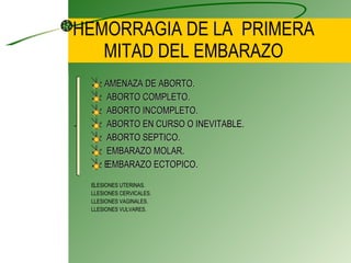 Este documento resume diferentes tipos de hemorragia en la primera mitad del embarazo como amenaza de aborto, aborto incompleto, completo y diferido. Describe el diagnóstico, tratamiento y manejo de cada condición incluyendo aborto séptico y ectópico. También define molas hidatidiformes completas y parciales así como coriocarcinoma, y provee pautas para su diagnóstico y tratamiento.
