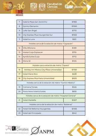 El documento presenta una lista de 30 hoteles sugeridos para hospedaje durante la Relme 36 en Ciudad de México. Los hoteles fueron seleccionados de booking.com con base en calificaciones de usuarios mayores a 7.5. Se proporciona información como ubicación, precio y enlace para cada hotel.