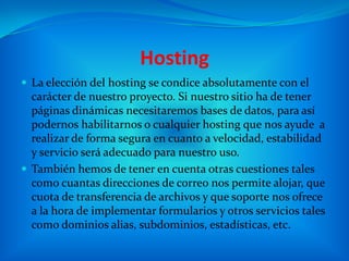 Este documento discute varios temas relacionados con el alojamiento web y la publicación de páginas web. Explica que el tipo de hosting debe elegirse en función del tipo de contenido del sitio web, como si requiere bases de datos o páginas dinámicas. También habla sobre otros factores a considerar como el espacio de almacenamiento y correo electrónico incluido. Luego discute sobre tipos de alojamiento como gratuito, compartido y de pago, y cómo el presupuesto y conocimientos técnicos influyen en el tipo