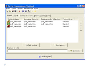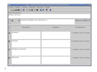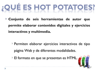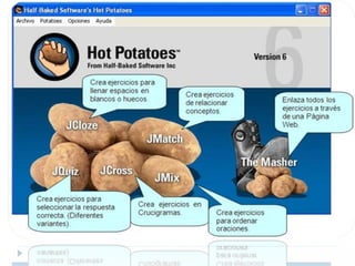 Este documento describe Hot Potatoes, un conjunto de seis herramientas de autor que permiten crear ejercicios interactivos y multimedia para el ámbito educativo. Las herramientas son Jquiz, Jcloze, Jcross, Jmatch, Jmix y Masher, y cada una permite crear un tipo diferente de ejercicio como crucigramas, emparejamientos o rellenar huecos. Hot Potatoes es fácil de usar y útil para cualquier asignatura, ya que no requiere conocimientos de programación.