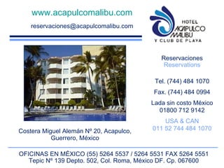 El documento proporciona información de contacto y detalles sobre las instalaciones y servicios del Hotel Acapulco Malibu en Acapulco, México. El hotel ofrece 80 suites a orillas de la playa con piscina, bar y restaurante, y está ubicado en una bahía conocida por sus puestas de sol. El documento invita a los lectores a reservar una estadía en el hotel para disfrutar de las vacaciones.
