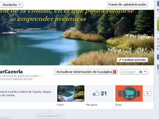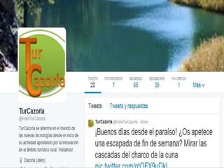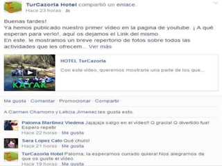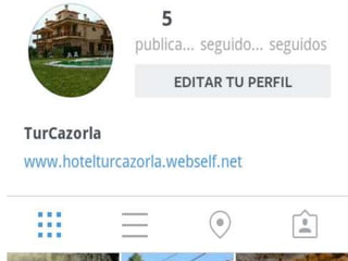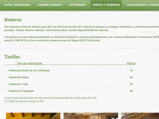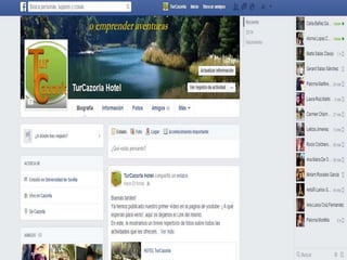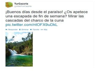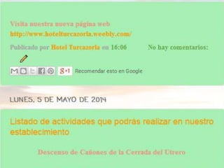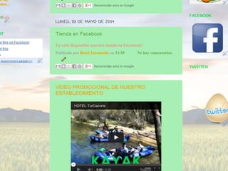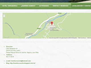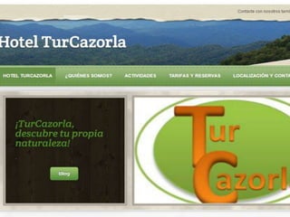 Este documento describe un hotel rural ubicado en el Parque Natural Sierra de Cazorla, Segura y las Villas. El hotel cuenta con 24 habitaciones equipadas y un restaurante. Además, ofrece varias actividades al aire libre como observación de animales, tiro con arco, kayak y senderismo. El hotel utiliza tecnologías como Facebook, Twitter e Instagram para promocionarse y mantenerse en contacto con los clientes.