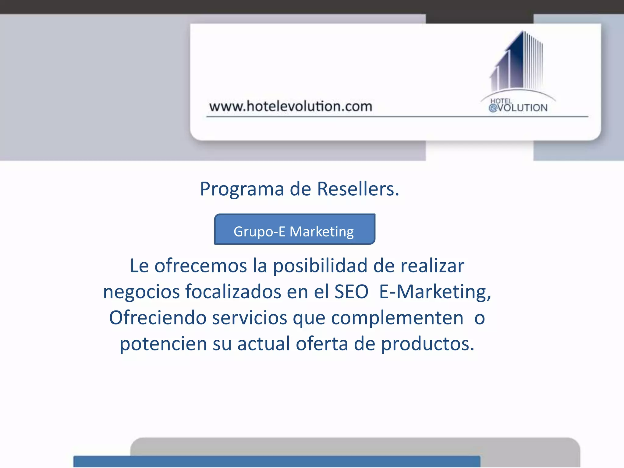 Este documento presenta una propuesta para que los resellers se asocien con Grupo-E Marketing para ofrecer servicios de SEO y e-marketing. Los resellers pueden ganar comisiones referiendo clientes o vendiendo los servicios directamente bajo una marca blanca. Grupo-E ofrece varios niveles de servicios SEO, soporte dedicado, capacitación y pagos rápidos de comisiones. Los resellers pueden ganar entre un 15-20% de comisión por venta dependiendo del monto de las ventas generadas.