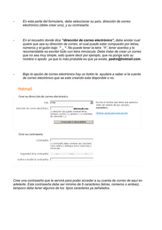 Para crear una cuenta de correo electrónico en Hotmail, el usuario debe ingresar la dirección www.hotmail.com en el navegador. Luego, completar un formulario con datos personales como país, nombre de usuario y contraseña. La contraseña debe tener al menos 6 caracteres y el nombre de usuario puede contener letras, números y guiones bajos. Finalmente, se verifica el código de seguridad y la cuenta queda creada.