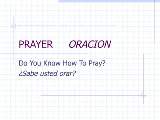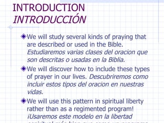 El documento describe doce tipos diferentes de oración que se mencionan en la Biblia, incluyendo alabanza, espera, confesión, lectura de las Escrituras, vigilancia, intercesión, petición, acción de gracias, canto, meditación y escucha. Explica brevemente cada tipo de oración y ofrece ejemplos bíblicos para ilustrarlos.