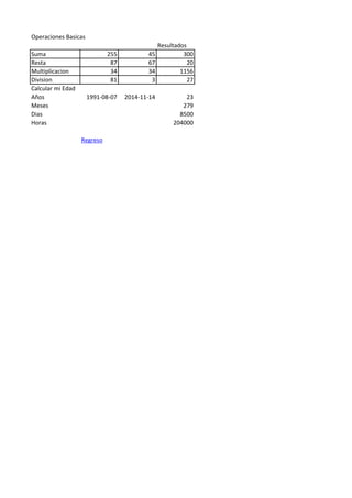 El documento presenta los resultados de varias operaciones matemáticas básicas como suma, resta, multiplicación y división. También incluye cálculos para determinar la edad de una persona en años, meses, días y horas. Además, contiene información personal como cédula, sexo, talla, edad y colores preferidos de una persona. Finalmente, presenta datos como teléfono, días de la semana, estado civil y fecha de nacimiento.