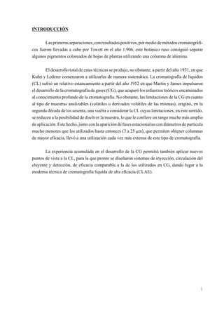 Este documento describe la cromatografía líquida de alta eficacia (CLAE), incluyendo su historia, proceso, tipos, instrumentación y componentes. La CLAE se utiliza para separar compuestos disueltos mediante la interacción diferencial de cada compuesto con fases móviles y estacionarias. La instrumentación clave incluye bombas, inyectores, columnas, detectores y registradores.