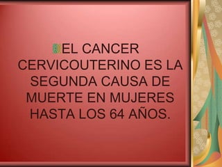 El cáncer cervical es la segunda causa de muerte en mujeres hasta los 64 años. La prevención primaria incluye la vacuna contra el VPH, mientras que la prevención secundaria y el diagnóstico temprano se logran mediante el Papanicolaou. La vacuna busca disminuir la morbimortalidad por cáncer cervical, especialmente en poblaciones vulnerables, mediante la inmunización de niñas a los 11 años. Algunos tipos de VPH son carcinogénicos y pueden causar cáncer cervical u otros cánceres, aunque la