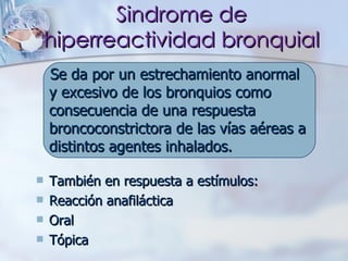 El documento habla sobre la hiperreactividad bronquial, que ocurre cuando los bronquios se estrechan excesivamente en respuesta a agentes inhalados como humo de cigarrillo o alergenos. Puede causar tos, silbidos y dificultad para respirar. Esto se debe a una contracción anormal del músculo liso bronquial mediada por inmunoglobulina E e inflamación. La hiperreactividad bronquial puede ser aguda, causada por infecciones respiratorias, o crónica como en el asma o EPOC.