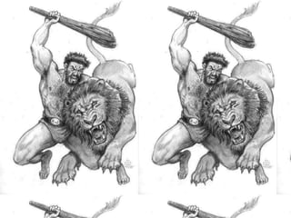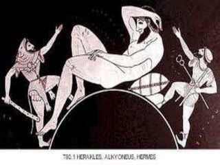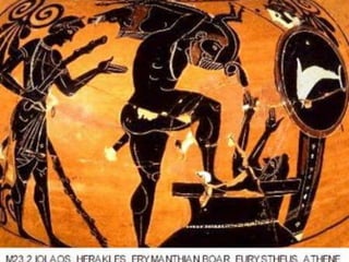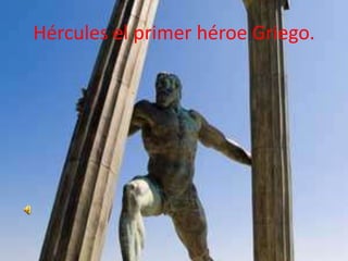 El documento narra la historia de Hércules, el primer héroe griego, y sus doce trabajos, que incluyen hazañas como matar al león de Nemea, capturar a la hidra y robar las manzanas de oro del jardín de las Hespérides. Los trabajos demuestran su fuerza y astucia, a menudo con la asistencia de otros personajes mitológicos. También se exploran elementos de la cosmogonía griega y las influencias de los dioses en las aventuras de Hércules.