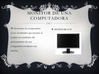 El documento describe los parámetros y características de los monitores de computadora. Explica que el monitor muestra los resultados del procesamiento de la computadora al usuario y cubre temas como píxeles, tamaño de punto, área útil, resolución máxima, tamaño de pantalla, proporción, medición, LCD frente a CRT y sus ventajas y desventajas.