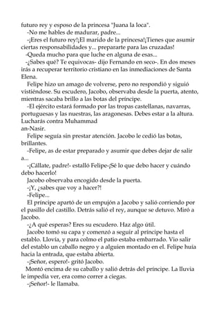 Este resumen describe la historia de Jacobo, un joven escudero que sirve a Felipe, el futuro rey de Aragón. Cuando Felipe muere en un accidente de caballo, el rey le pide a Jacobo que lo reemplace en la cruzada próxima. Jacobo acepta y lucha en la cruzada, donde experimenta la brutalidad de la guerra. Sobrevive pero queda desilusionado con la religión. Al recuperarse, cuestiona al rey sobre el poder de Dios y la justicia divina.